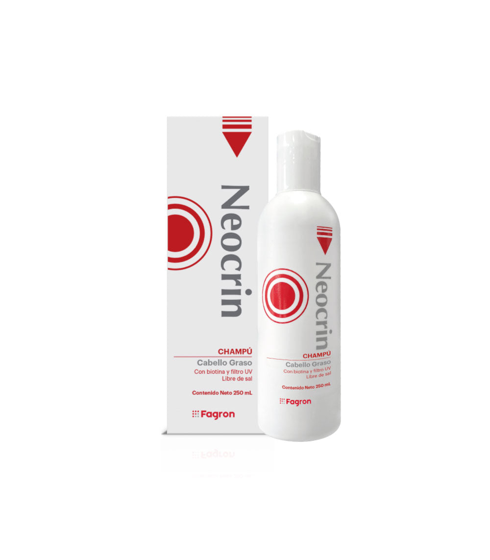 Neocrin Champú, suave fórmula, hidratante y libre de sal que permite mantener el control de frizz del cabello. No contiene parabenos.
